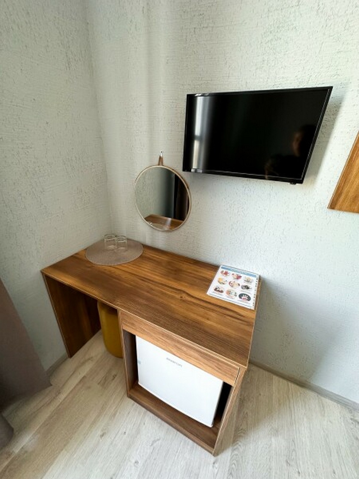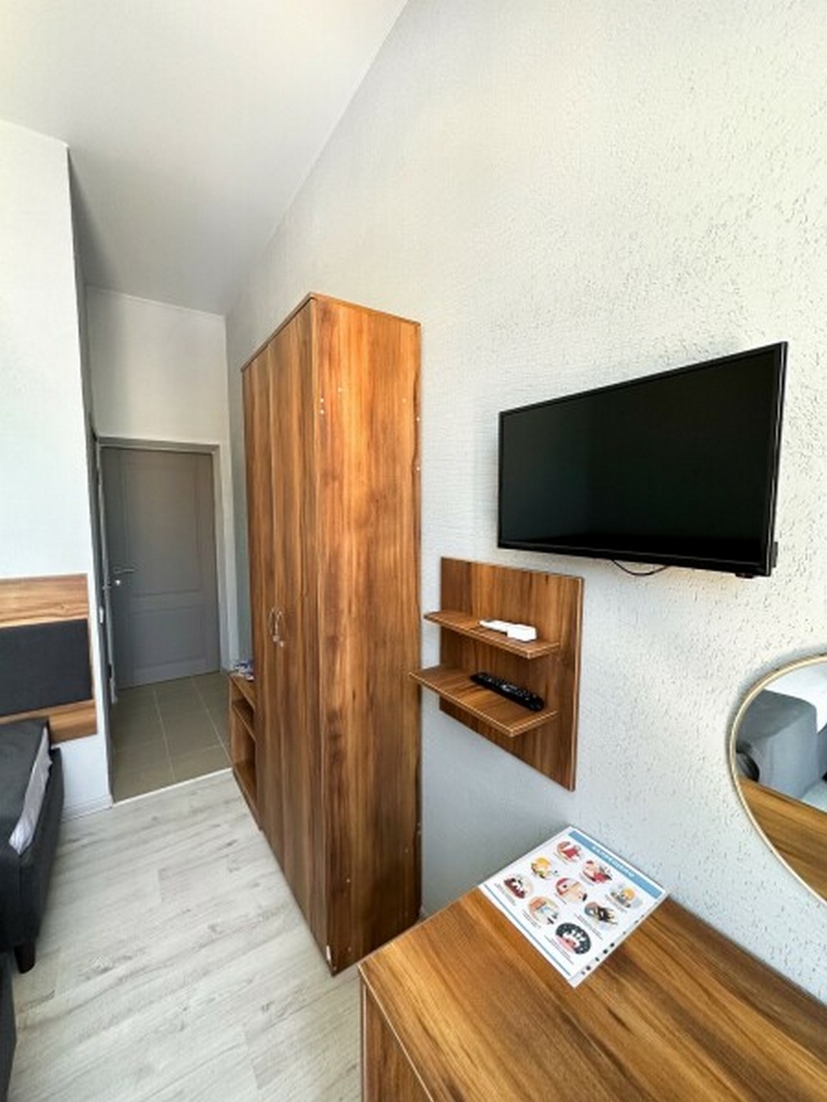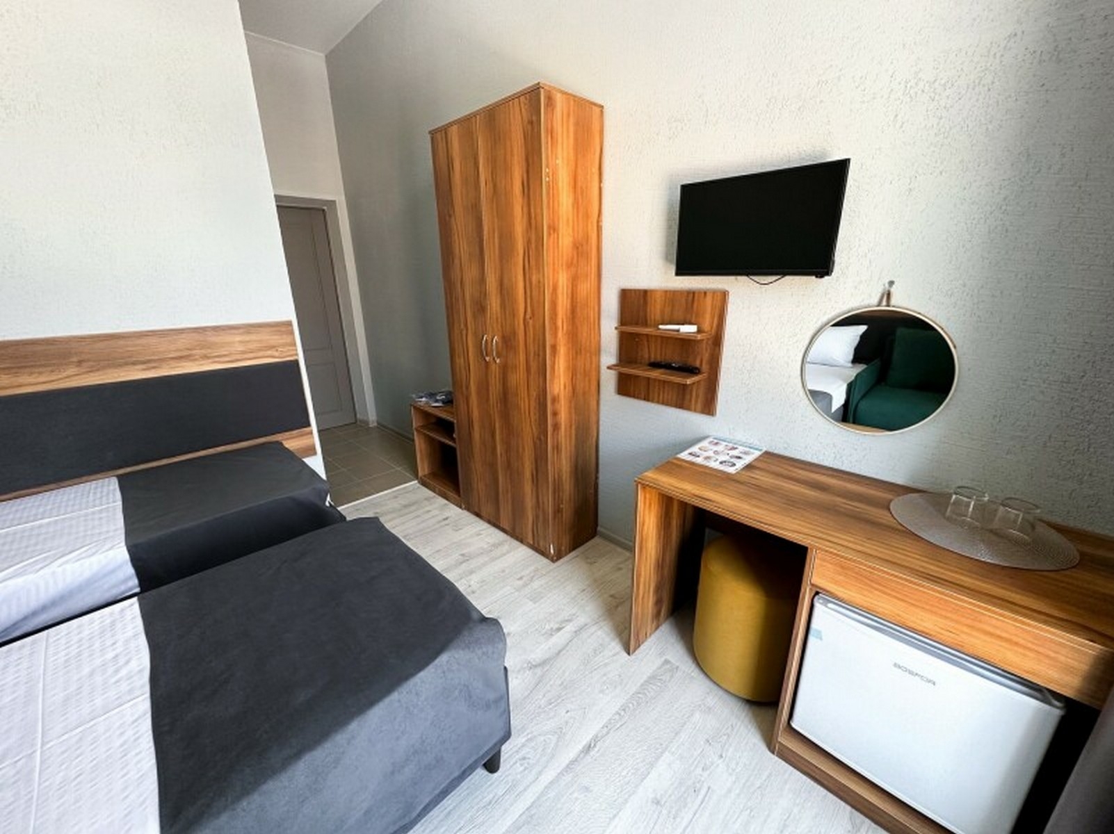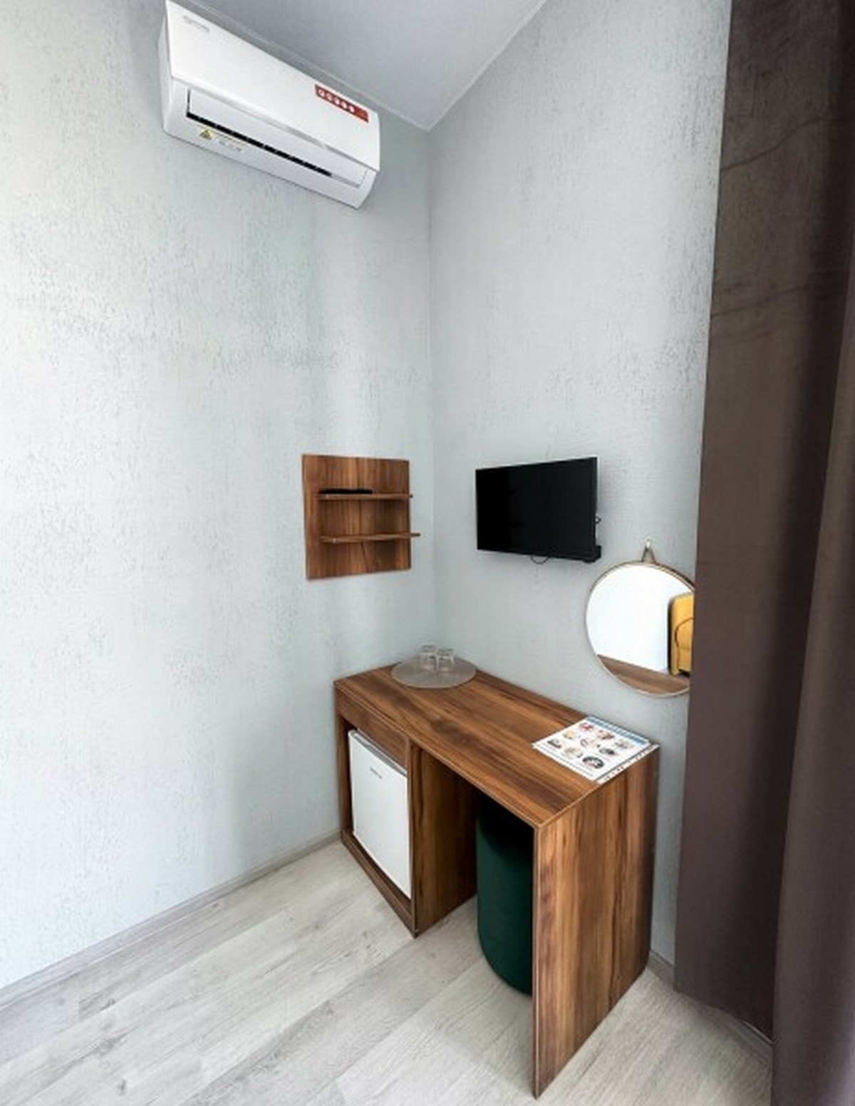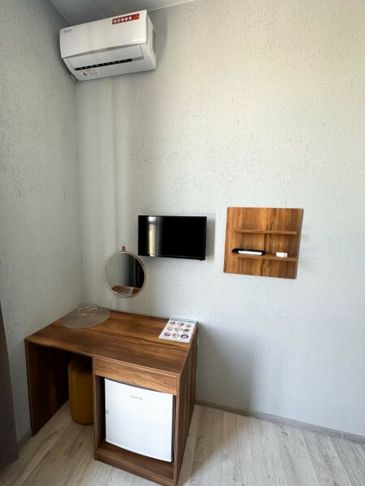 Имеется телевизор, кондиционер, вешалка, зеркало, рабочий стол, холодильник, стулья.